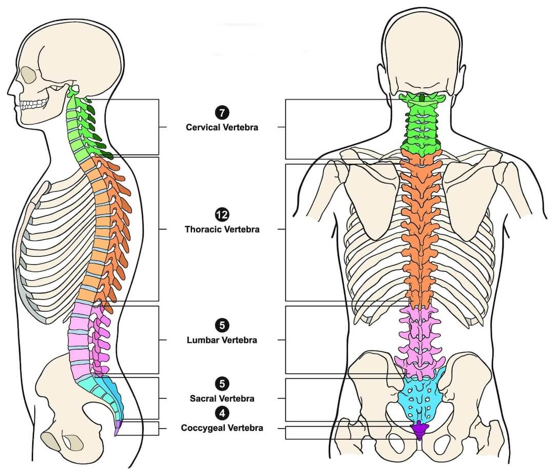 When viewed from the front or back, the normal spine is in a straight line, with each vertebra sitting directly on top of the other. Curvature to one side or the other indicates a condition called scoliosis.