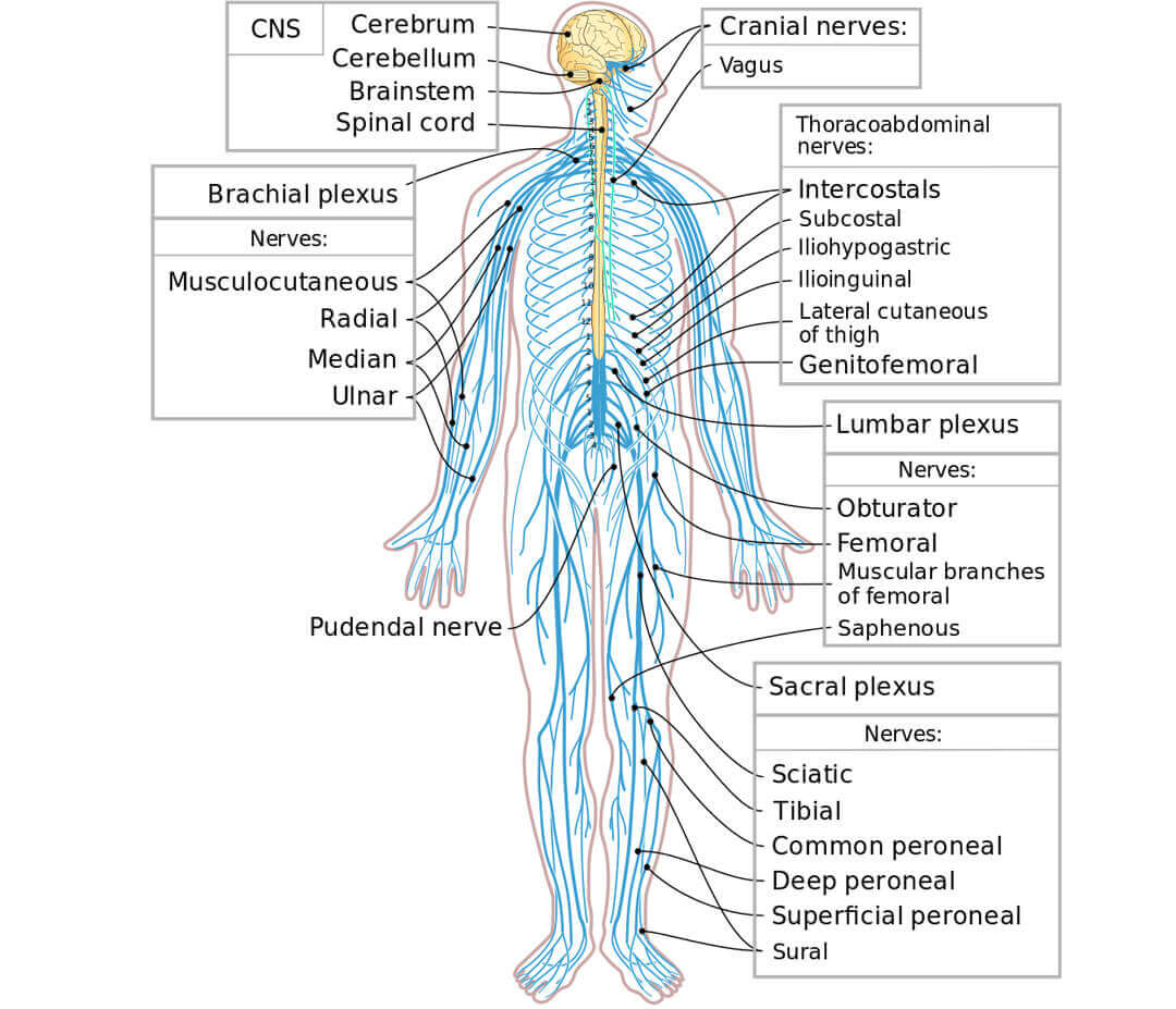 The nerves in each area of the spinal cord are connected to specific parts of the body. Those in the cervical spine, for example, extend to the upper chest and arms; those in the lumbar spine the hips, buttocks and legs. The nerves also carry electrical signals back to the brain, creating sensations. Damage to the nerves, nerve roots or spinal cord may result in symptoms such as pain, tingling, numbness and weakness, both in and around the damaged area and in the extremities.