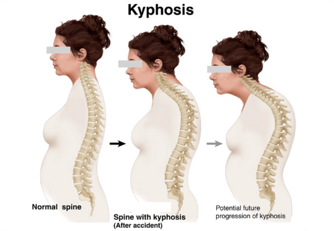 The neck must be extended in order for the head to face forward, which can result in neck pain. Multiple compression fractures of the midback can lead to loss of height, breathing issues, and digestive problems due to the decrease in space for the internal organs.