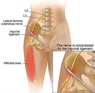 Meralgia paresthetica is chronic pain, numbness, and tingling in the outer part of your upper thigh. Although it seems like a random type of pain to experience, it is actually a result of a pinched nerve in the pelvic region. As the lateral femoral cutaneous nerve passes through the groin to supply feeling to the outer part of the thigh. It can become pinched by tight pants or belts, excess fatty tissue, or for unknown reasons. This nerve only provides a sensory sensation and not muscle function so paralysis from the pinching of this nerve will not occur.
