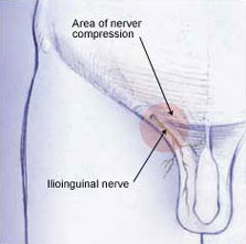 The iliohypogastric nerve is another nerve that is present within the abdomen that has a complex course through the body. Damage to this nerve from surgery or from direct trauma can result in neuralgia. Patients complain of a burning abdominal pain immediately following trauma. This pain can radiate to the area just above the genitals (called the suprapubic region) and occasionally the genitalia as well.
