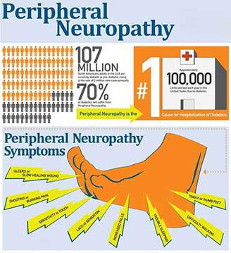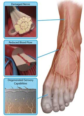 Peripheral neuropathy in diabetes is related to the sugar levels in the blood, and can sometimes be the first symptoms that present. Patients complain of burning sensation in their feet and pins and needles in their hands, known as ‘glove and stocking’ anaesthesia meaning the alteration in sensation is seen or the hands and feet. In addition, patients may have alteration in certain neurological signs such as the reflexes and muscle tone. Treatment of diabetic neuropathy primarily involves aggressive management of diabetes and good blood sugar control.