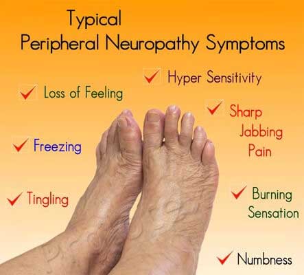 Symptoms vary, depending on which types of nerves are affected. Common signs and symptoms may include gradual onset numbness and tingling in the feet or hands, burning pain, sharp, jabbing or electric-shock-type pain, extreme sensitivity to light touch. Individuals may experience muscle weakness or paralysis if motor nerves are affected, or heat intolerance and bowel/bladder or digestive problems if autonomic nerves are affected