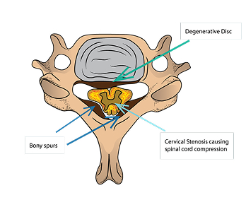 Spinal stenosis pain in the neck is called cervical spinal stenosis. This condition means that there is potential compression of the spinal cord. Unfortunately, the spinal cord compression can lead to serious problems such as extreme weakness, or even paralysis. With cervical stenosis, anyone who develops signs of spinal cord compression (myelopathy) may need more invasive treatment, such as surgery.