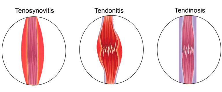 The term tendinopathy includes both tendon degeneration (tendinosis) and tendon dysfunction accompanied by inflammation (tendinitis). Tendinosis is mainly used to refer to the degenerative tissue changes in tendons that may or may not be painful and that are not associated with inflammation. The term tendinopathy specifically refers to painful tendon conditions, which are usually associated with tendon inflammation, at least in acute forms of tendinopathy. Tendinopathy is mainly due to overuse of tendons. Tendon injury is common during physical exercise, for example, when intense forces are exerted on tendons. Work-related repetitive movements are also a common source of tendinopathy.