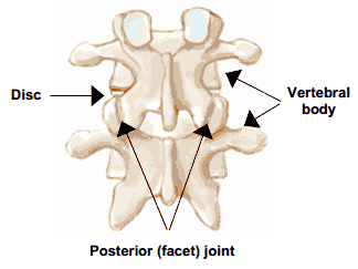 Facet joints (a.k.a. Zygopophyseal joints) are located on the back (posterior) part of the spine and their alignment allow for movement, such as bending forward or backwards and twisting of the neck and upper back. There are two facet joints between each pair of vertebrae, one on each side of the spine.