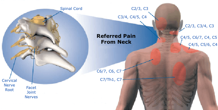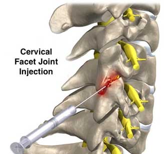 Pain caused by arthritis of the joints in the cervical spine (facet joints) can be treated with cervical facet joint injections, also known as medial branch blocks. This type of injection procedure is also done under fluoroscopic guidance. It works by blocking the nerve signals from the facet joints of the cervical spine and can relieve pain and allow for improved movement of the neck. If a patient experiences greater than 50% improvement in their pain with two consecutive injections spaced one month apart, subsequent treatment regimen includes radiofrequency ablation of the cervical facet joints. This procedure involves burning of the nerves that arise from the facet joints of the cervical spine and can offer 6-8 months of relief.
