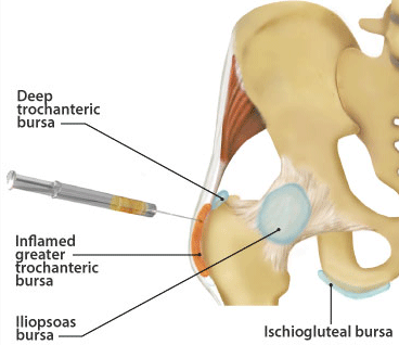 Corticosteroid injection in the Trochanteric Bursa is considered an effective therapy with prolonged benefits. Bursa injection involve injection of a local anesthetic with 40-80 mg of steroids like methylprednisolone acetate or triamcilone acetonide into the bursa. The injection can be repeated at 4-6 weeks, if pain relief has been less than 50%.