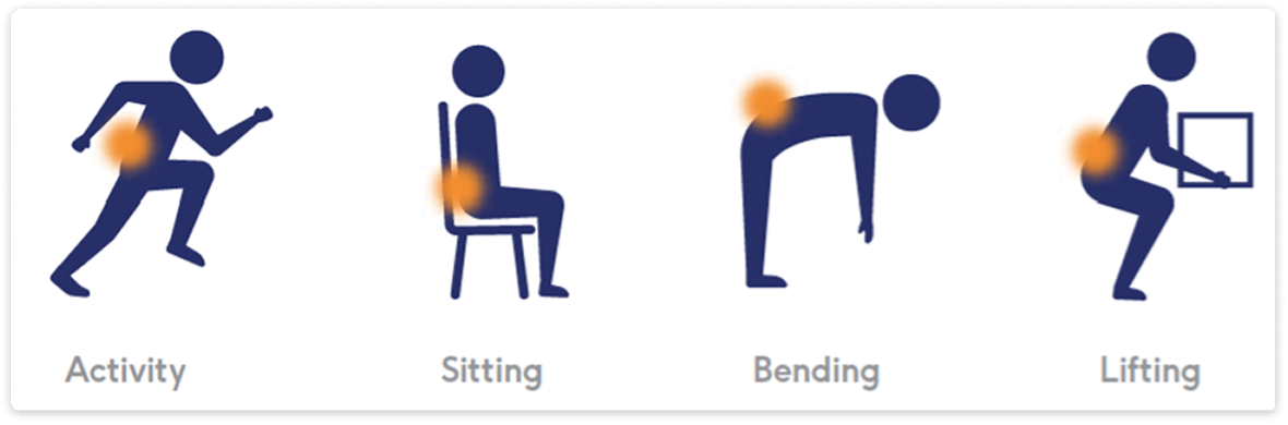 Pain worsened by physical activity, prolonged sitting, bending, or lifting