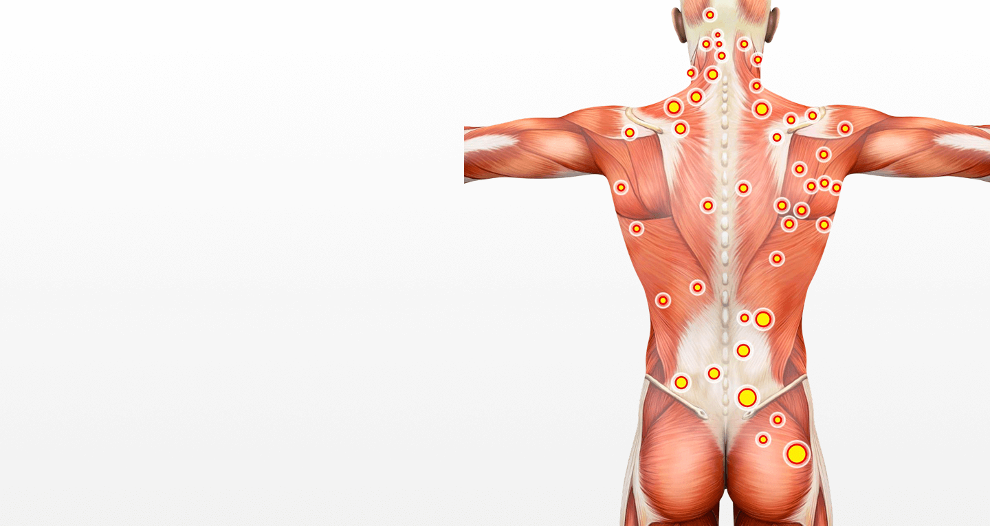 Trigger points are often tender, firm knots in the muscles that when pushed, can feel as small as a pea or as large as a walnut – embedded within the muscle tissue. The pain one feels from pressing on a trigger point usually radiates in a region that is away from the trigger point.