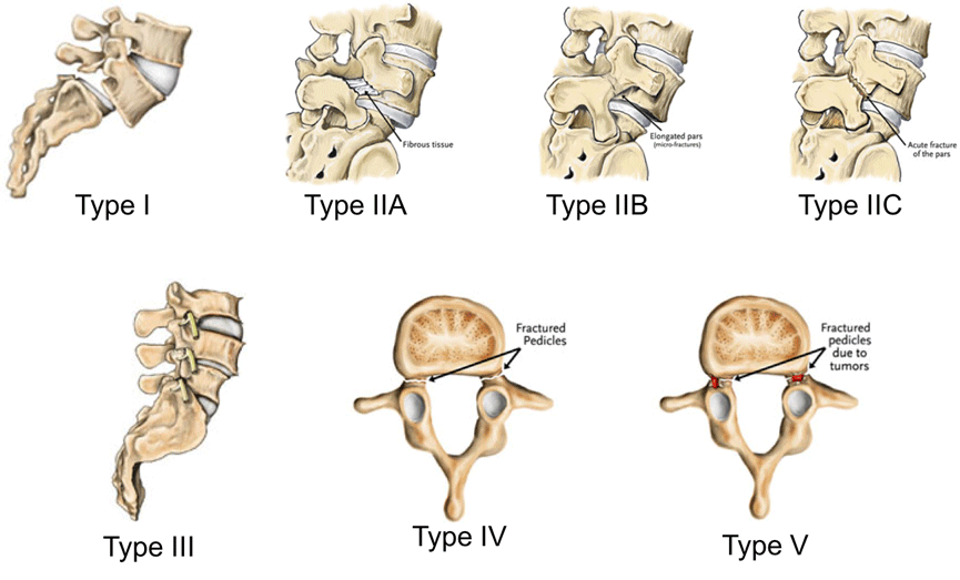Type V, pathologic spondylolisthesis, occurs because of a structural weakness of the bone secondary to a disease process such as a tumor or other bone disorder.