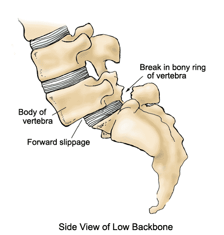 Spondylolisthesis: The word spondylolisthesis comes from the Greek words spondylos, which means “spine” or “vertebra,” and listhesis, which means “to slip or slide.” If the stress fracture weakens the bone so much that it is unable to maintain its proper position, the vertebra can start to shift out of place. This condition is called spondylolisthesis (spon-dee-low-lis-thee-sis). If too much slippage occurs, the bones may begin to press on nerves and surgery may be necessary to correct the condition.